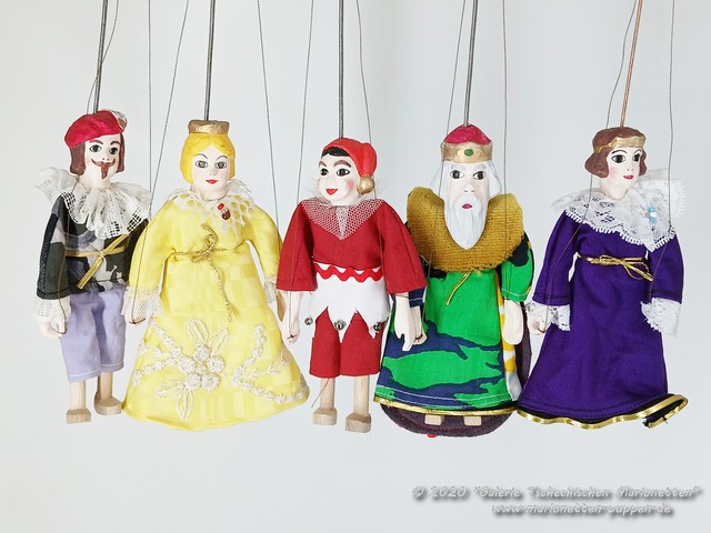 La famille royale marionnettes classique tchèque: Roi, Reine, Prince, Princesse, Bouffon