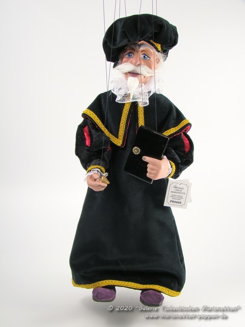 Alchimiste marionnette décorative tchèque est dirigée à l’aide de fils, de câbles et un balancier (bascule) spécial en forme de croix. Le corps de la marionnette, les jambes et les chaussures sont fabriqués en bois. La tête et les mains de la marionnette sont faites en masse spéciale pour la fabrication des sculptures. Pour la fabrication des vêtements il est utilisé différents types de textile, de matériaux naturels de lin, de velours, soie, de coton, de cuir. La poupée est peinte à la main avec des peintures inoffensives, résistantes à l’eau. La marionnette peut être utilisée comme un jouet de développement ou comme un souvenir tchèque original, un cadeau original.