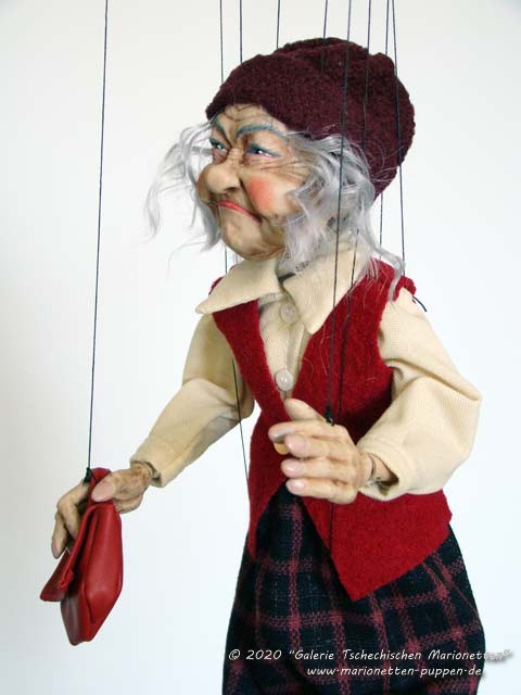 Marionnette Grand mère les jambes et les chaussures sont fabriqués en bois. La tête et les mains sont faites en matériel élastique spécial résistant au choc. Les vêtements de la marionnette sont fabriqués à la main avec des matériaux naturels de lin, de coton, de cuir.