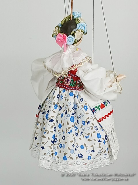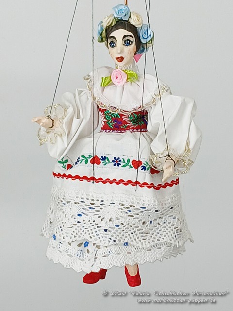 Une marionnette tchèque décorative est contrôlée à l'aide de fils, de fils et d'une bascule cruciforme spéciale (levier). Sa tête, ses bras et ses jambes sont moulés en plâtre modifié pour les sculptures, le corps est en bois de tilleul. Pour confectionner les vêtements, nous utilisons différents types de textiles et de matières naturelles : lin, coton ou cuir.