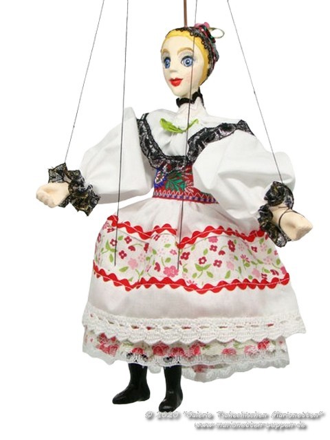 Une marionnette tchèque décorative est contrôlée à l'aide de fils, de fils et d'une bascule cruciforme spéciale (levier). Sa tête, ses bras et ses jambes sont moulés en plâtre modifié pour les sculptures, le corps est en bois de tilleul. Pour confectionner les vêtements, nous utilisons différents types de textiles et de matières naturelles : lin, coton ou cuir.