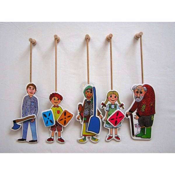 Théâtre de poupées domestique. Le théâtre de poupées a 18 marionnettes et un jeu de décors. Le théâtre est complet et prêt pour un spectacle. Sur demande, vous pouvez compléter le théâtre avec d’autres marionnettes et d’autres scènes de l’assortiment de notre magasin.