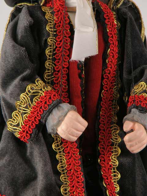 Vampire Le squelette classique de la marionnette les jambes et les chaussures sont fabriqués en bois. La tête et les mains de la marionnette sont faites en masse spéciale pour la fabrication des sculptures. La poupée est manipulée à l’aide d’un balancier en forme de croix, des câbles et fils métalliques. Pour la fabrication des vêtements est utilisé différents types de textile, de matériaux naturels de lin, de velours, soie, de coton, de cuir. La marionnette peut être utilisée comme un cadeau original, un jouet d’enfant mais également pour un spectacle dans un théâtre domestique.